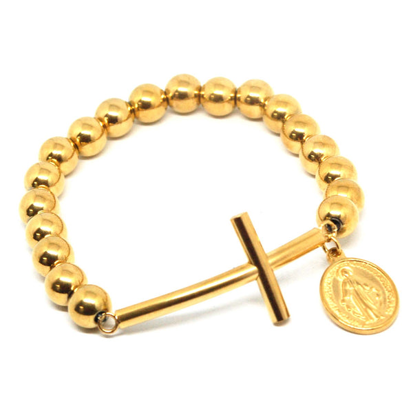 ESBL 6583: Gold Plated 19-Steel Ball Bracelet w/ Crucifix Center & Rosary